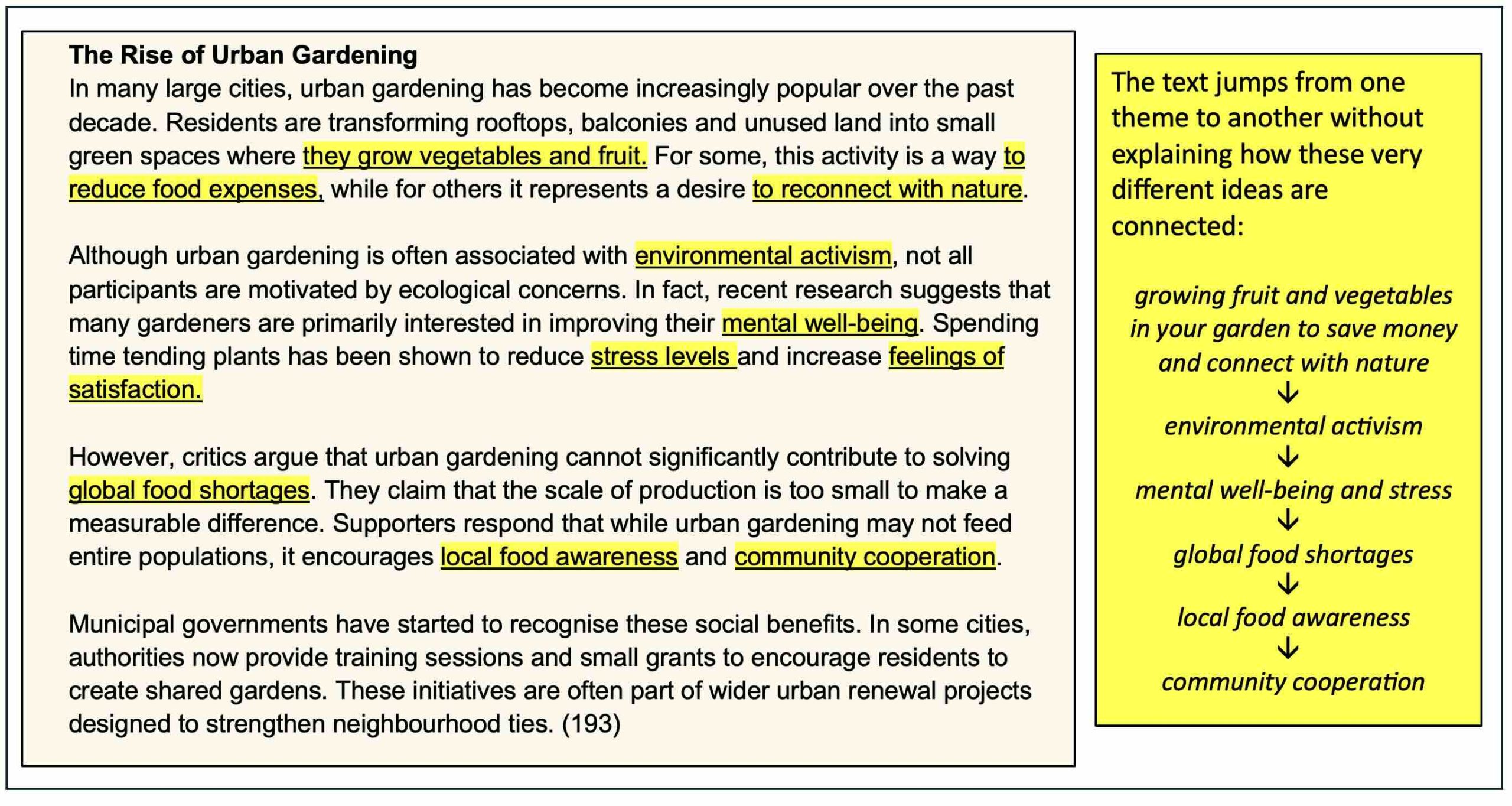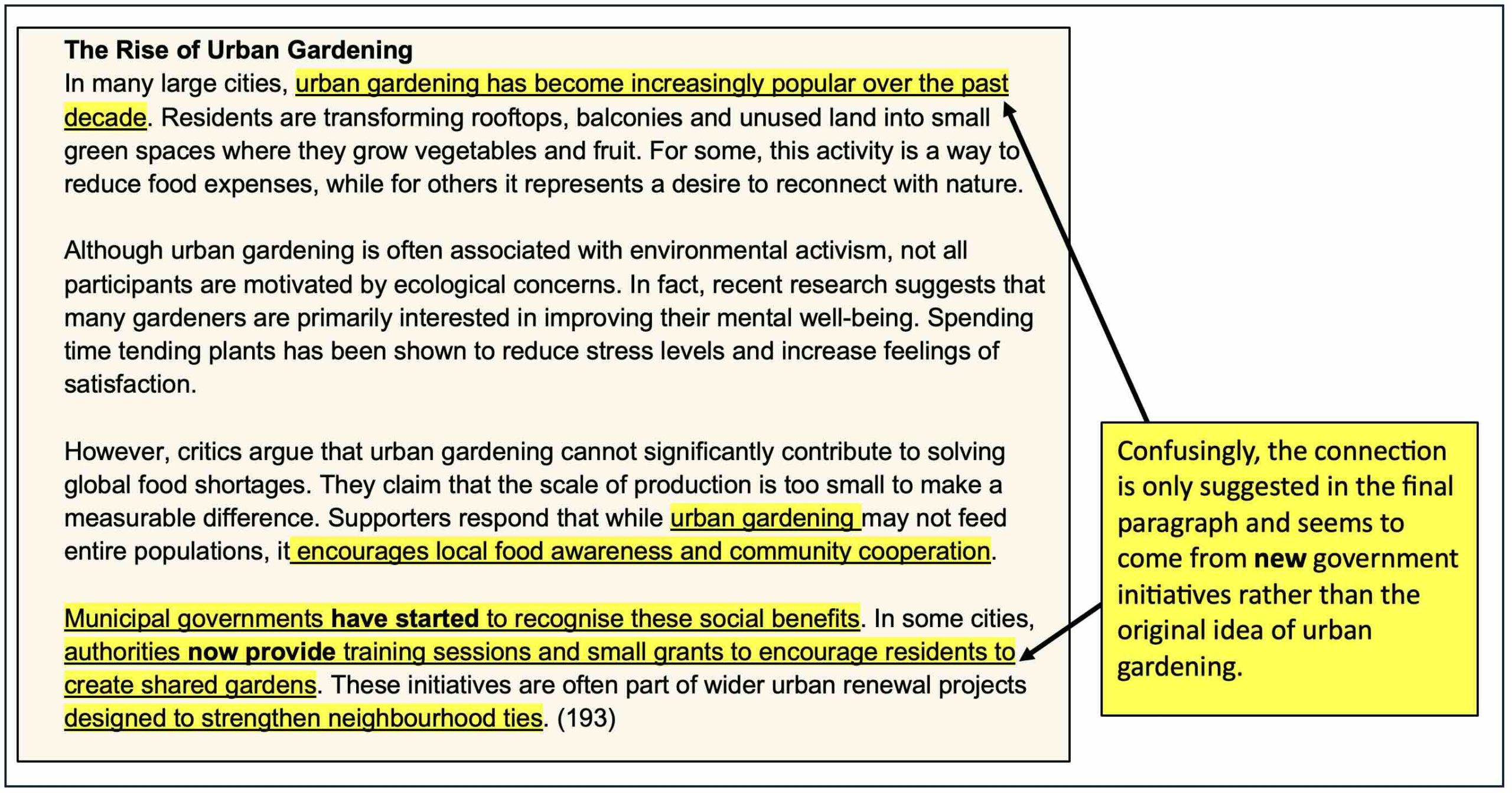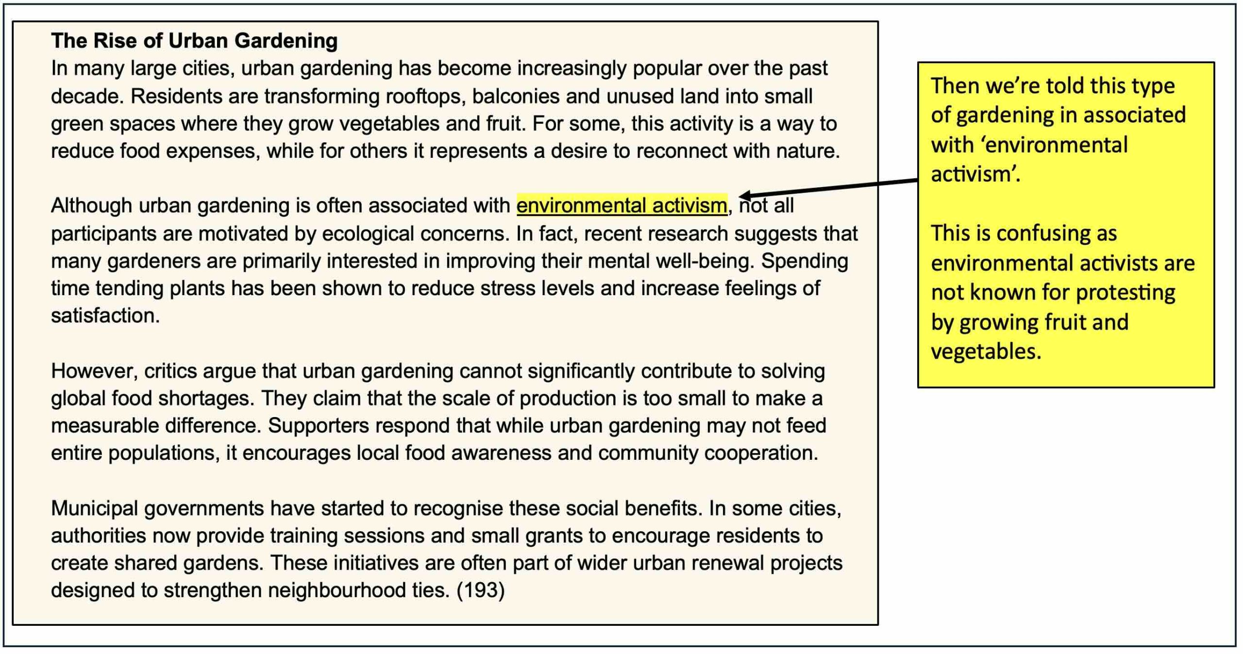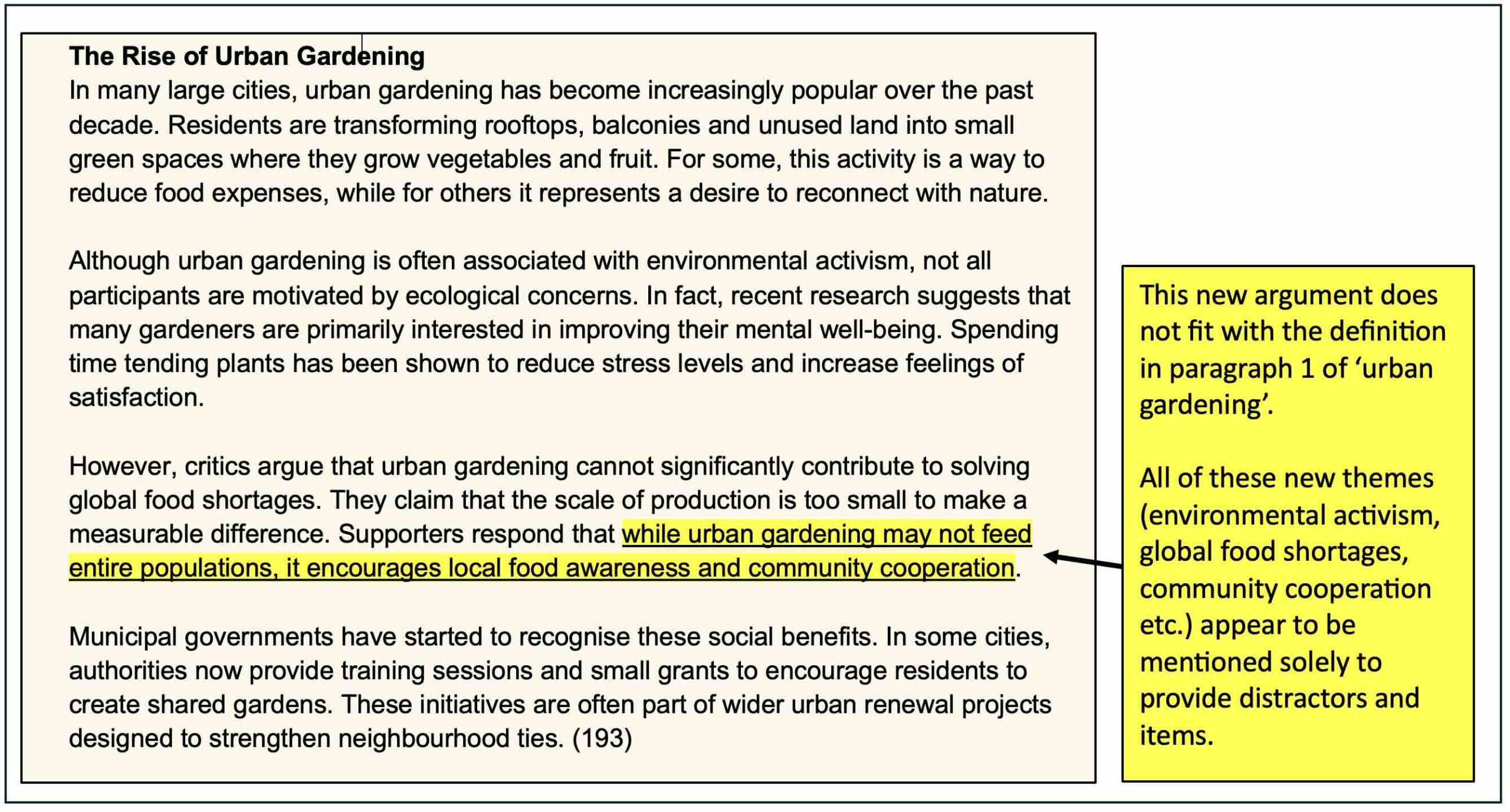 These problems in the text are important. The lack of logical connection and cohesion means that we cannot assess the test takers understanding of how ideas are connected. Instead, the focus has to be on individual sentences. This is confirmed when we look at the items and how they work.