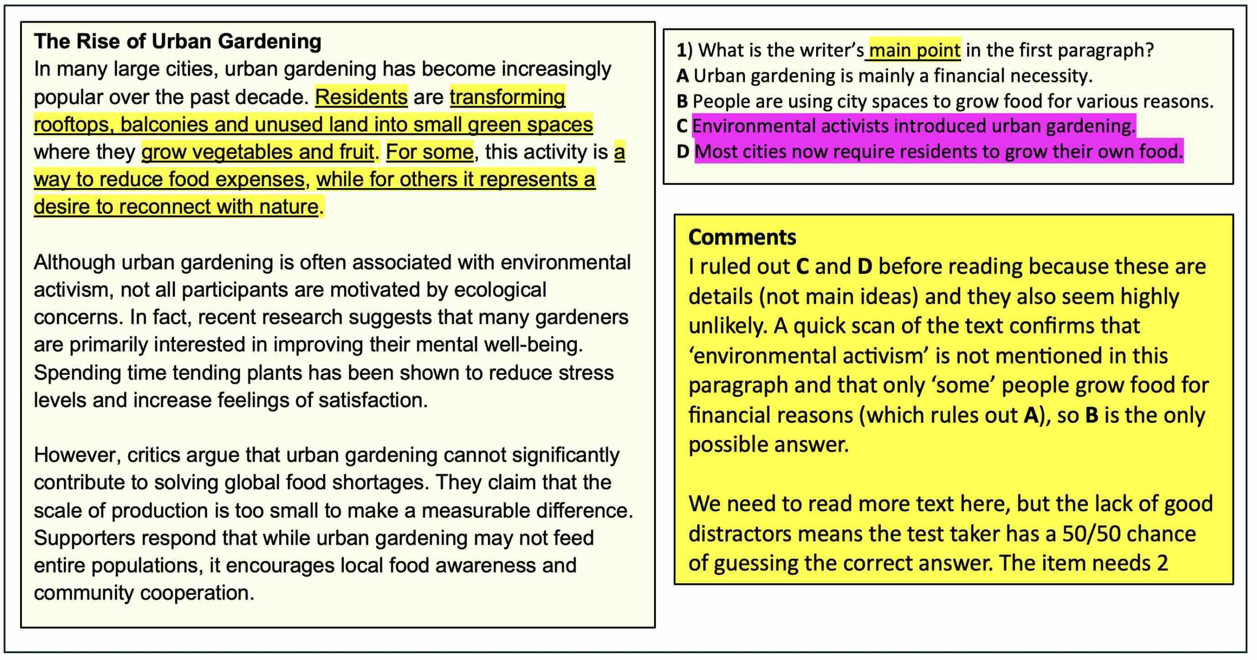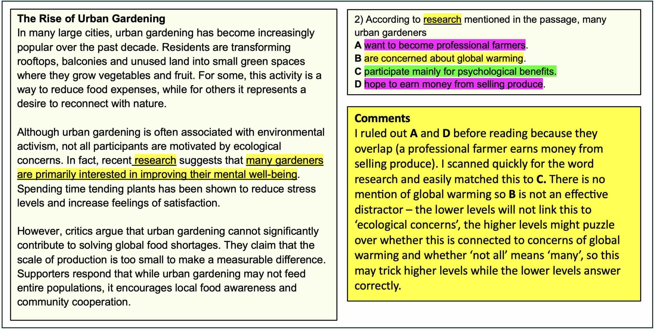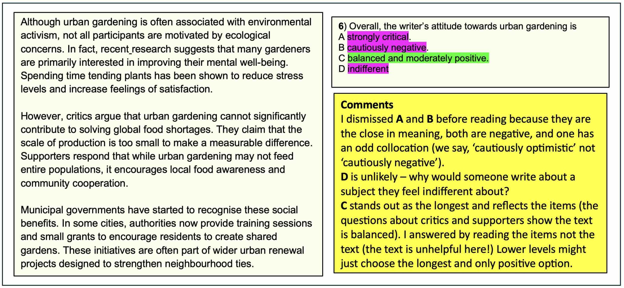 AI is an attempt to automate a task. When items are automated, it is easy to find the patterns, which also reflect that beliefs and bias of the people who programmed this particular agent. For example, we can see that ‘distractors’ are created by using more extreme words than in the text (e.g. the item says ‘only’ or ‘mainly’ but the text says ‘some’), or there is no mention in the appropriate part of the text (a good sign that there is not enough information here for a multiple choice task).  The correct options are often the longest, because these are the only ones that are clear and more accurately reflect the test. These problems reflect those typically found in online test materials or in books written by those who lack test writing skills. Easily identified patterns like this lead to test takers believing there are ‘tricks’ they can use to avoid reading – this is not true in well-written test materials.