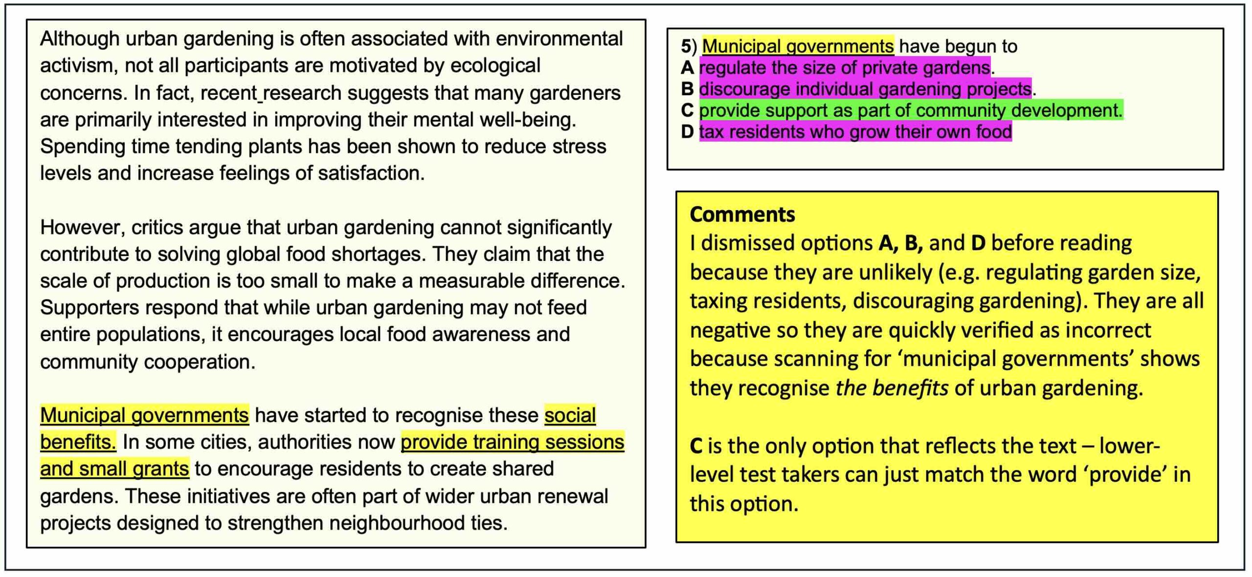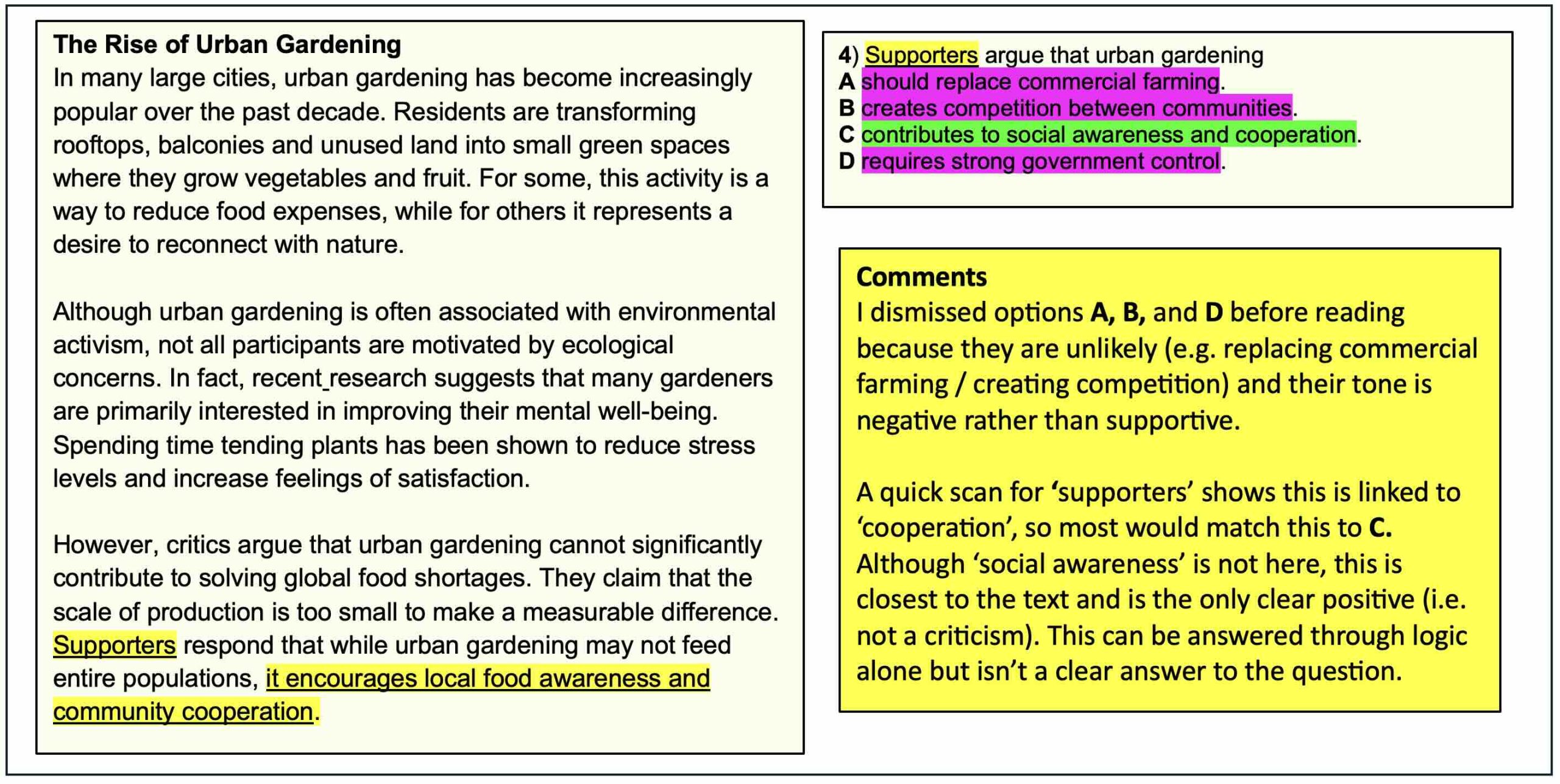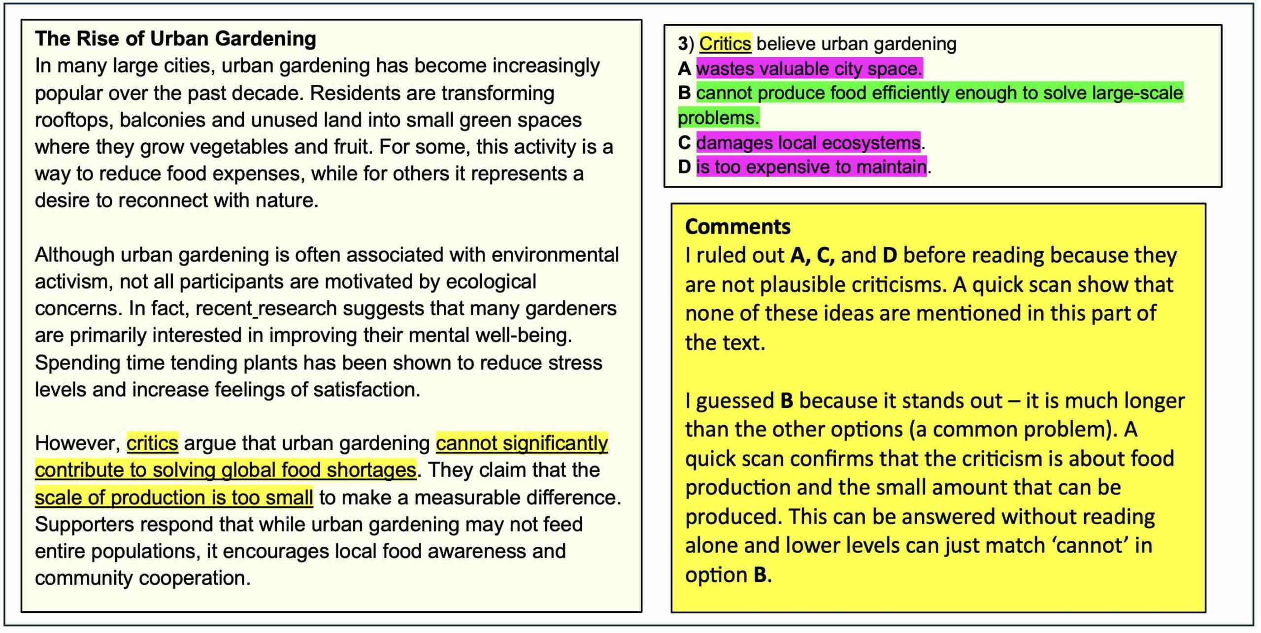 AI is an attempt to automate a task. When items are automated, it is easy to find the patterns, which also reflect that beliefs and bias of the people who programmed this particular agent. For example, we can see that ‘distractors’ are created by using more extreme words than in the text (e.g. the item says ‘only’ or ‘mainly’ but the text says ‘some’), or there is no mention in the appropriate part of the text (a good sign that there is not enough information here for a multiple choice task).  The correct options are often the longest, because these are the only ones that are clear and more accurately reflect the test. These problems reflect those typically found in online test materials or in books written by those who lack test writing skills. Easily identified patterns like this lead to test takers believing there are ‘tricks’ they can use to avoid reading – this is not true in well-written test materials.